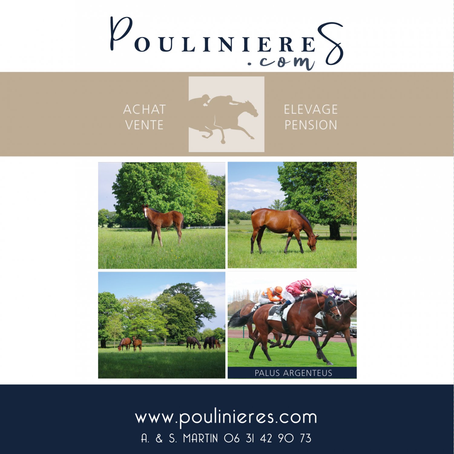 Depuis plusieurs années, sur les terres du Château du Plessis et de l’ancien hippodrome de Combrée (49), Poulinieres.com développe des services d'élevage reconnus pour leur qualité auprès de fidèles clients éleveurs hors-sol français et anglo-saxons. Poulinieres.com sélectionne des juments (à vocation plat mais aussi obstacles) bien nées, issues de familles vivantes, avec idéalement du black type à toutes les générations. L’élevage de Sylvain Martin privilégie également les juments ayant un modèle prometteur pour une bonne entrée au haras : cadre, os.